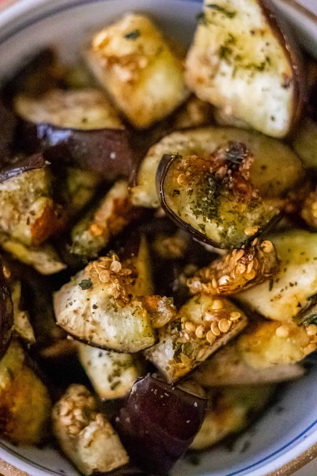Use Enough Oil: Eggplant acts like a sponge, so coat it generously with olive oil to help it roast properly and avoid drying out. Toss well to ensure even coverage.