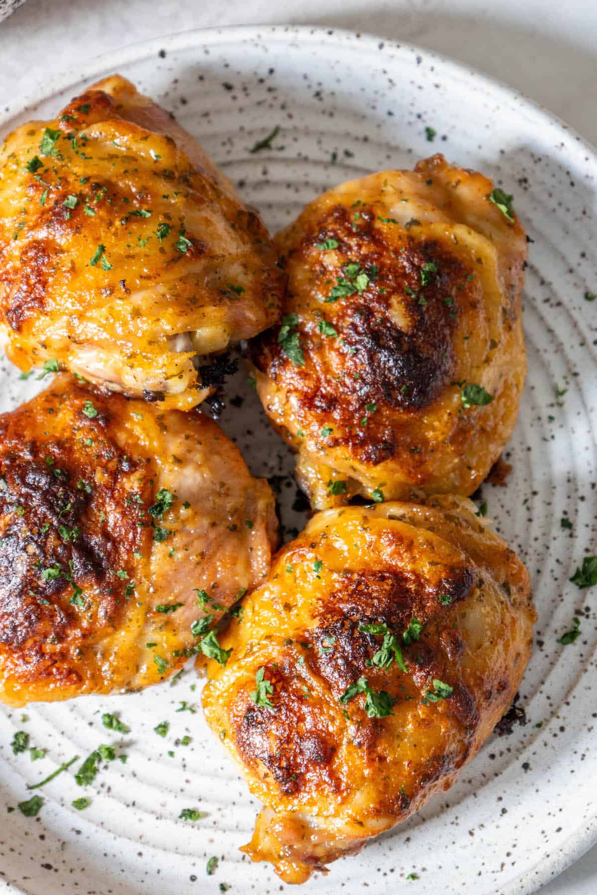 This recipe was designed to work for both skin-on or skinless chicken thighs – as well as boneless or bone-on thighs. The method you will use is the same overall (you might want to pan fry chicken skin a few minutes longer for more crunch if using skin-on thighs), but just know you’ll need to plan on a slightly increased cook time for bone-in thighs. Check your thighs while cooking and keep in oven until the fattest part of the thigh reaches an internal temperature of 165 degrees Fahrenheit.