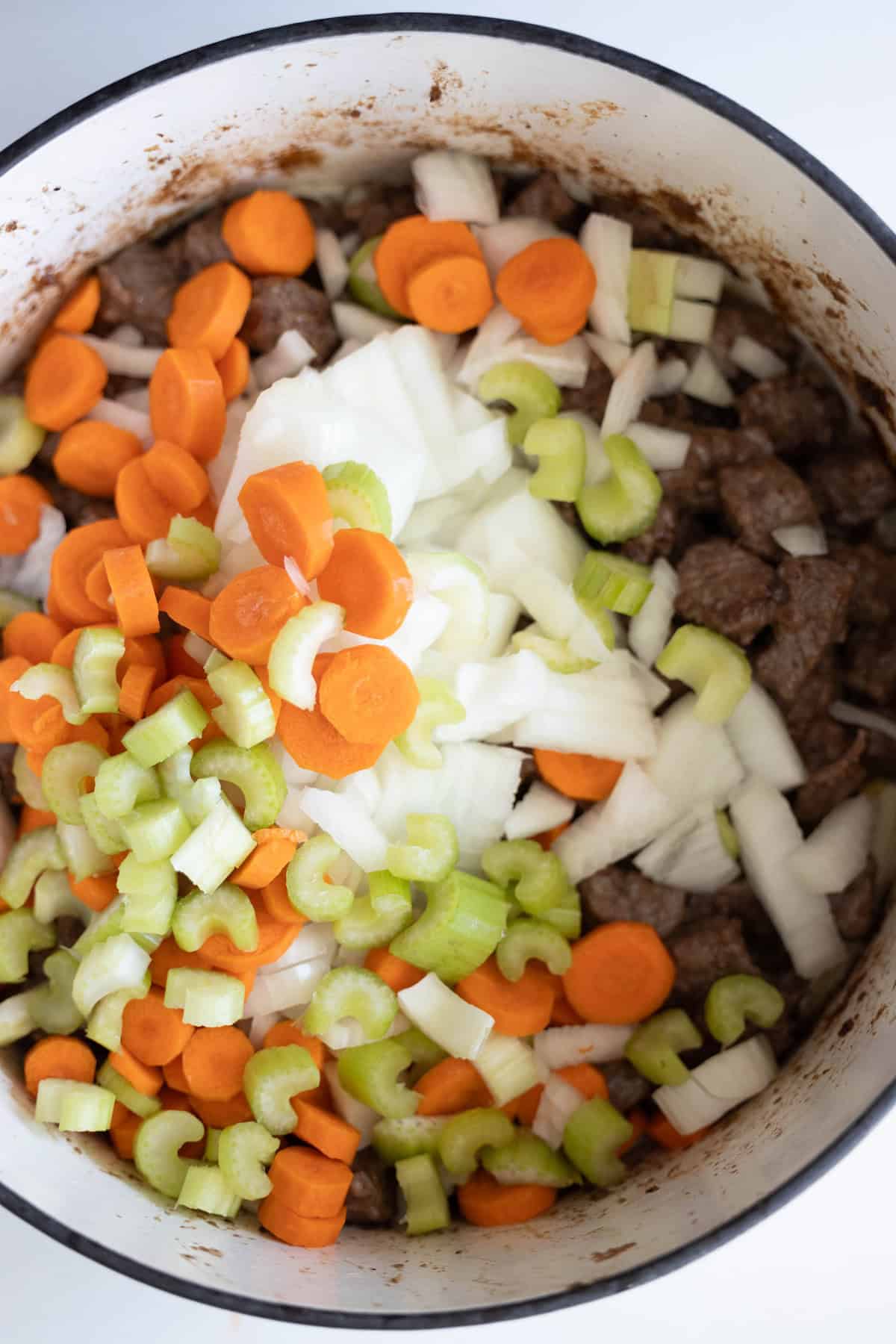 - After the beef has cooked for about 1.5 hours, add the carrots, baby potatoes (either whole or halved), and celery to the pot. Stir well and let everything simmer for another 30 to 40 minutes until the vegetables are tender.