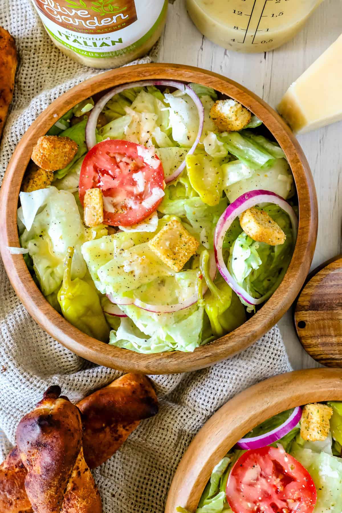 The perfect copycat Olive Garden salad has to have all the components of the classic salad – crunchy lettuce, tangy spicy pepperoncini, plump tomatoes, savory onions, and crunchy croutons all topped with a creamy Zesty Italian inspired dressing.