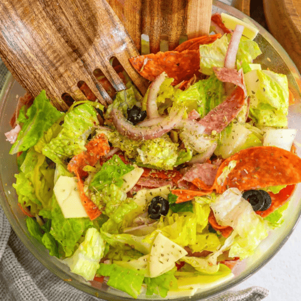 This copycat of Olive Garden’s iconic salad is the perfect combination of crispy lettuce, tomatoes, tangy pepperoncini, black olives, crunchy croutons, tossed in a homemade zesty creamy dressing – it’s my favorite easy, simple side!