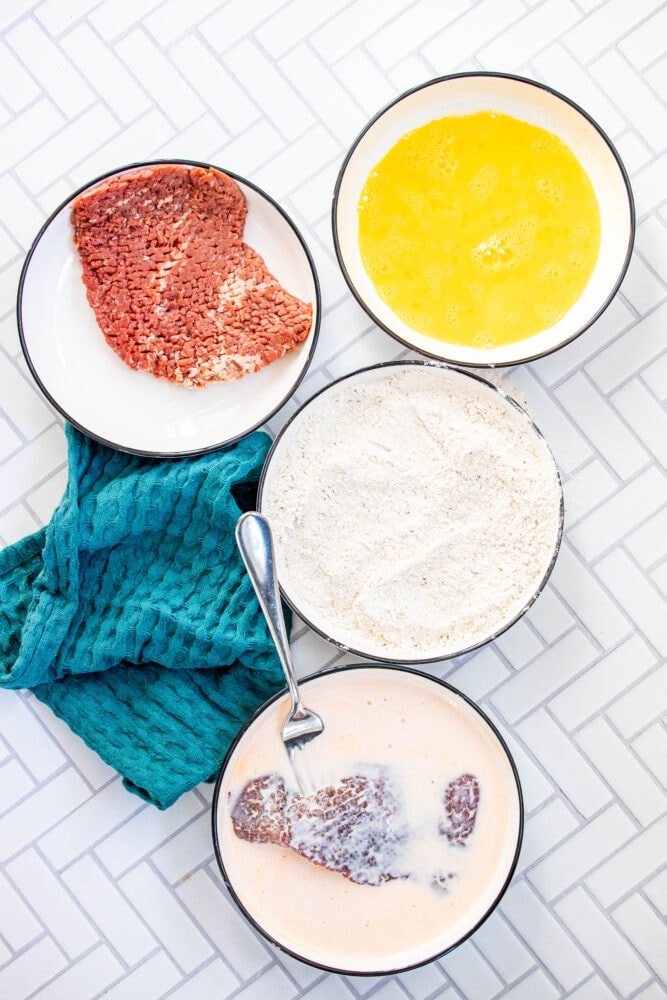 - Dredge steaks by dipping first in milk, then flour, then egg, and finally flour again to fully coat in breading. Shake off any excess flour.
